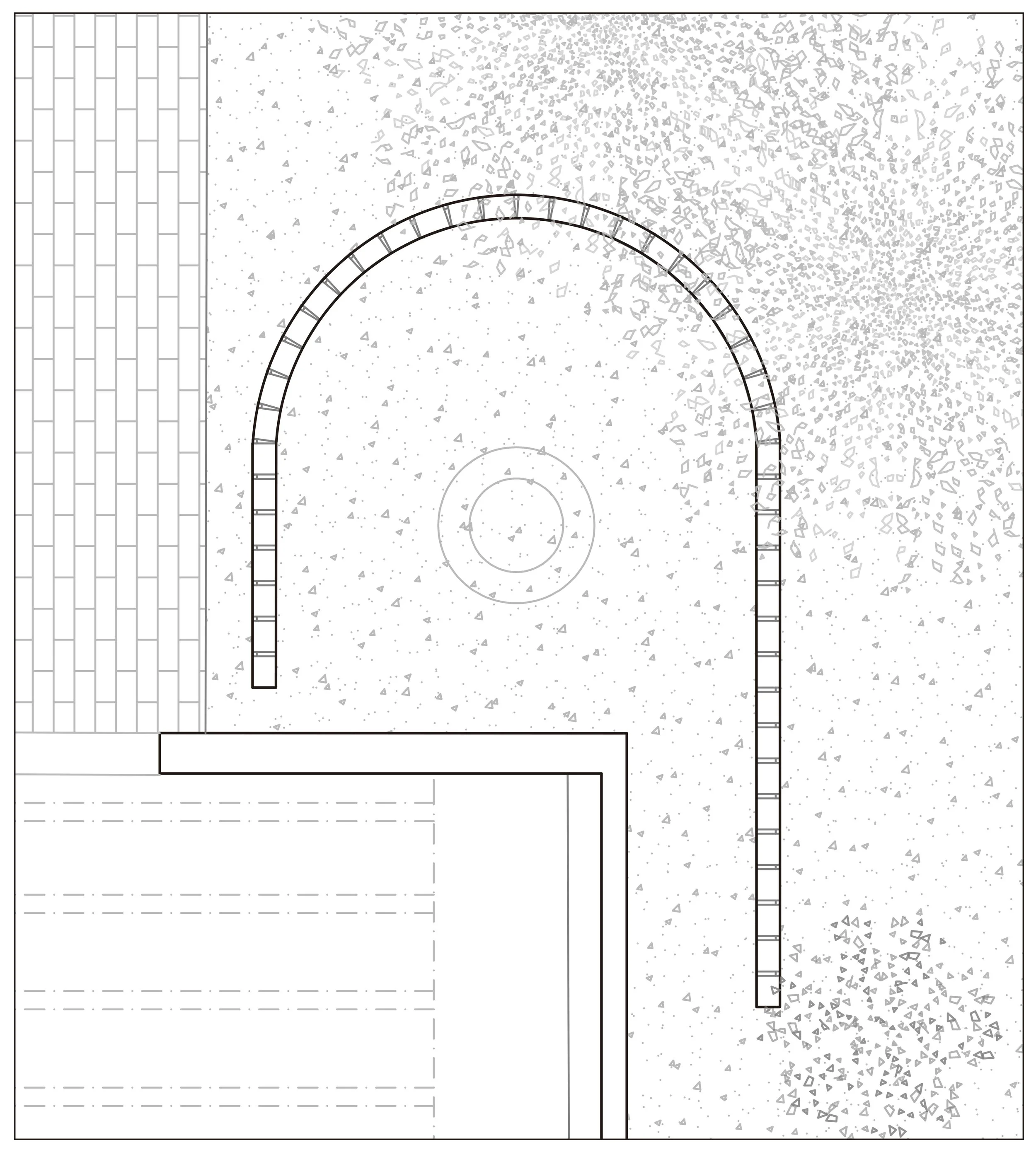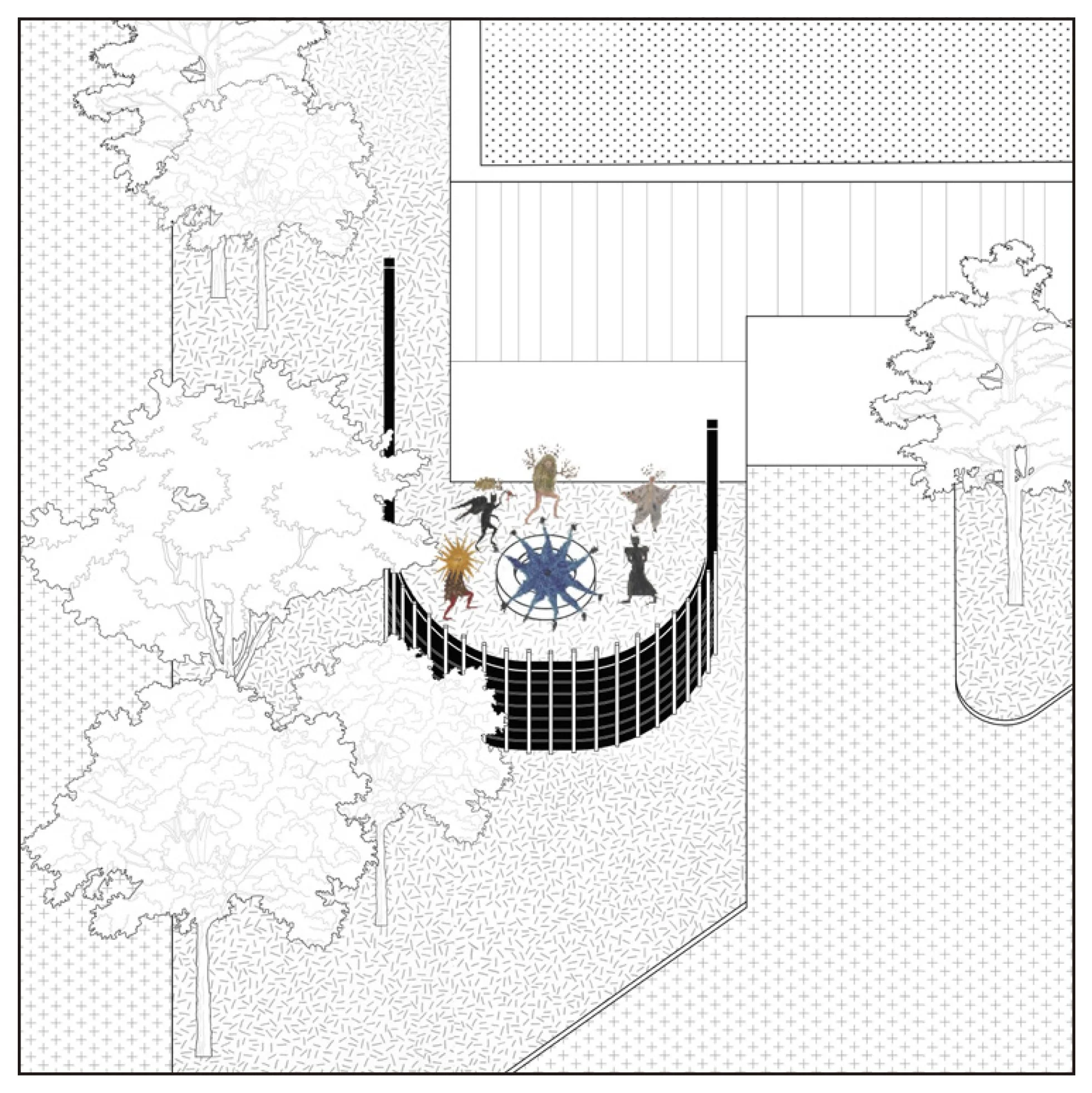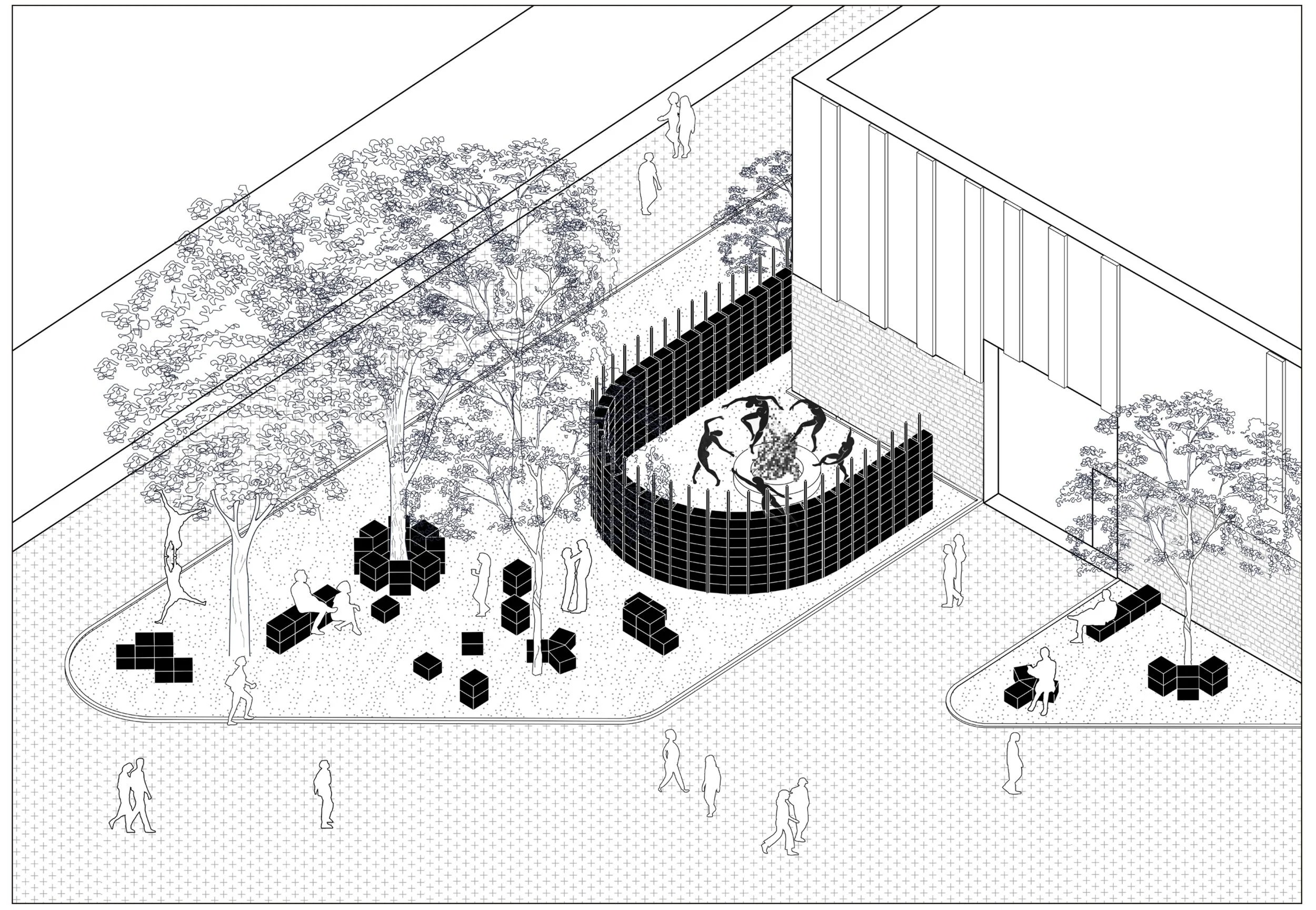 The spatial setup is simple. An inward-facing pavilion creates a more contained and calm space, while a series of small interventions extend into the surrounding site. Together, they allow different ways of gathering, from more intimate moments to open and informal use.